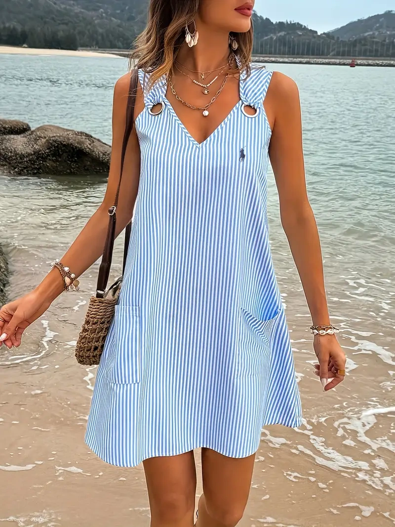 This Striped Sleeveless Dress is a versatile and stylish addition to your wardrobe. The adjustable buttons at the shoulders allow for a perfect fit, while the two front square pockets add both functionality and style. The mini length is perfect for any occasion.Shipping & Returns:
